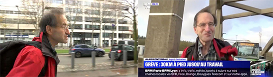 經(jīng)過諸多媒體的報道后,就有記者找到阿蘭·馮特諾,經(jīng)采訪得知他家住伊夫林省拉韋里耶爾鎮(zhèn)。在公交系統(tǒng)罷工已經(jīng)持續(xù)多日的情況下,與很多大巴黎地區(qū)的居民一樣,他下班返家面臨極大困難。上班時,他通常每天早上6點半開始以分時段的方式工作,有時下班時間是晚上8點。罷工開始后,他與公司協(xié)商后將上班時間提前至早上6時,這樣他每天就可以從家中乘坐一趟夜班車進城。至于下班后通勤就變得異常棘手了。而他只有兩種選擇,第一種就是步行至巴黎蒙巴納斯火車站乘坐遠郊鐵路N線或U線。但罷工期間,這些線路只在下午4點半后才開始恢復(fù)運行;而第二種選擇就是全程步行回家,距離是30公里。徒步需然后先后穿行圣西爾、圣康丹、特拉普等市鎮(zhèn),然后才回到拉韋里耶爾鎮(zhèn)的家中。
